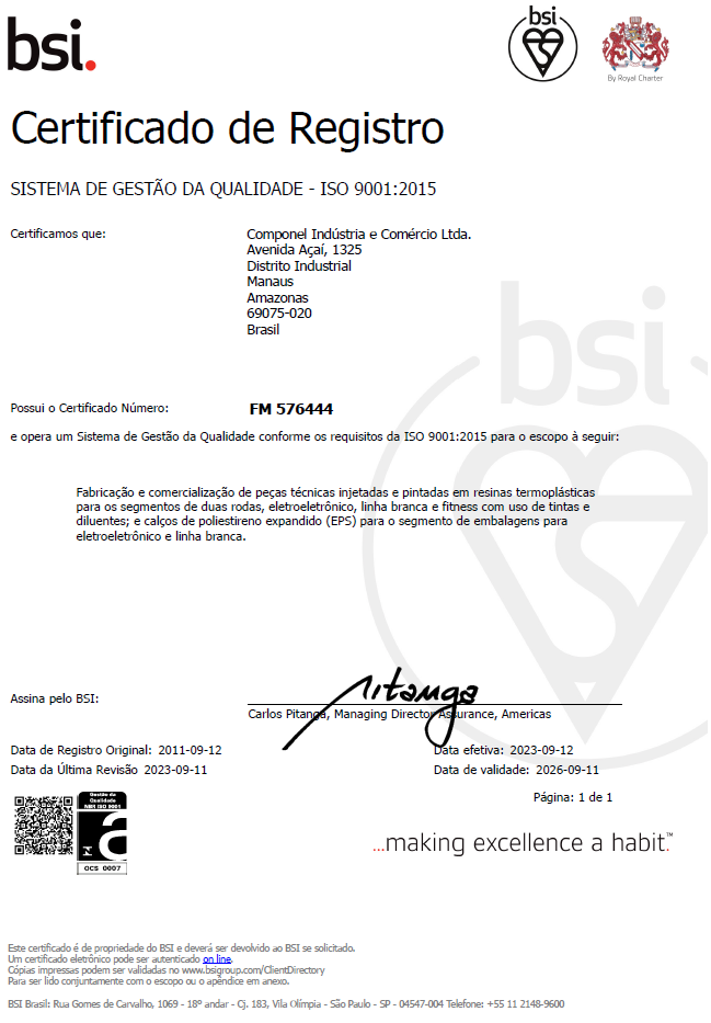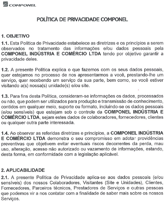 Fabricação e comercialização de peças técnicas injetadas para o segmento de polo duas rodas, eletroeletrônico, linha branca e fitness. Fone: (92) 3182-3605 Sistema de Gestão Integrado “Fornecimento de produtos, dentre outros, do segmento de transformação de plásticos, que satisfaçam, não só aos requisitos legais, como também às especificações de nossos clientes”. “Primar pela excelência no atendimento ao cliente, assim como à legislação pertinente para consolidar-se como líder em seu segmento de mercado”. – Melhoria da qualidade de seus produtos, através da conscientização, treinamento e comprometimento de todos os colaboradores; A LGPD deve ser observada por todos que realizam operação de tratamento (PF ou PJ, pública ou privada, por qualquer meio, de dados que estão no Brasil). As infrações cometidas estão sujeitas à penalidades que variam de advertência até multa de 2% do faturamento, limitado à 50 milhões de reais. Todas as empresas precisam revisar seus processos para avaliar todo tratamento realizado, identificando o que precisa ser ajustado, inclusive do ponto de vista de Segurança digital. Essa não é uma tarefa fácil, mas poderá se tornar mais assertiva e eficaz com apoio de uma consultoria especializada em LGPD, com conhecimentos em compliance, questões jurídicas e de Segurança da Informação. Nós da Componel contamos com estrutura que atenda sua empresa desde por todo o processo, desde o regulatório (compliance, jurídico) até o técnico especializado de segurança da informação. 02 – PHD-COMPONEL – 04 -Política de tratamento humano e não discriminação associação 03 – Política de Divulgação de Informações 04 – Política de Extração Responsável de Minerais 05 – Política de Integridade nos negócios 06 – Política de Não retaliação 10 – PMD-COMPONEL-00 -Politica de Medidas Disciplinares 11 – Política de Empréstimo Consignado 12 – Política de Inexistência de Vantagens Indevidas 13 – Política de Jornada de Trabalho 14 – Política de Proibição de Sanção Pecuniária Seja um cliente Componel.